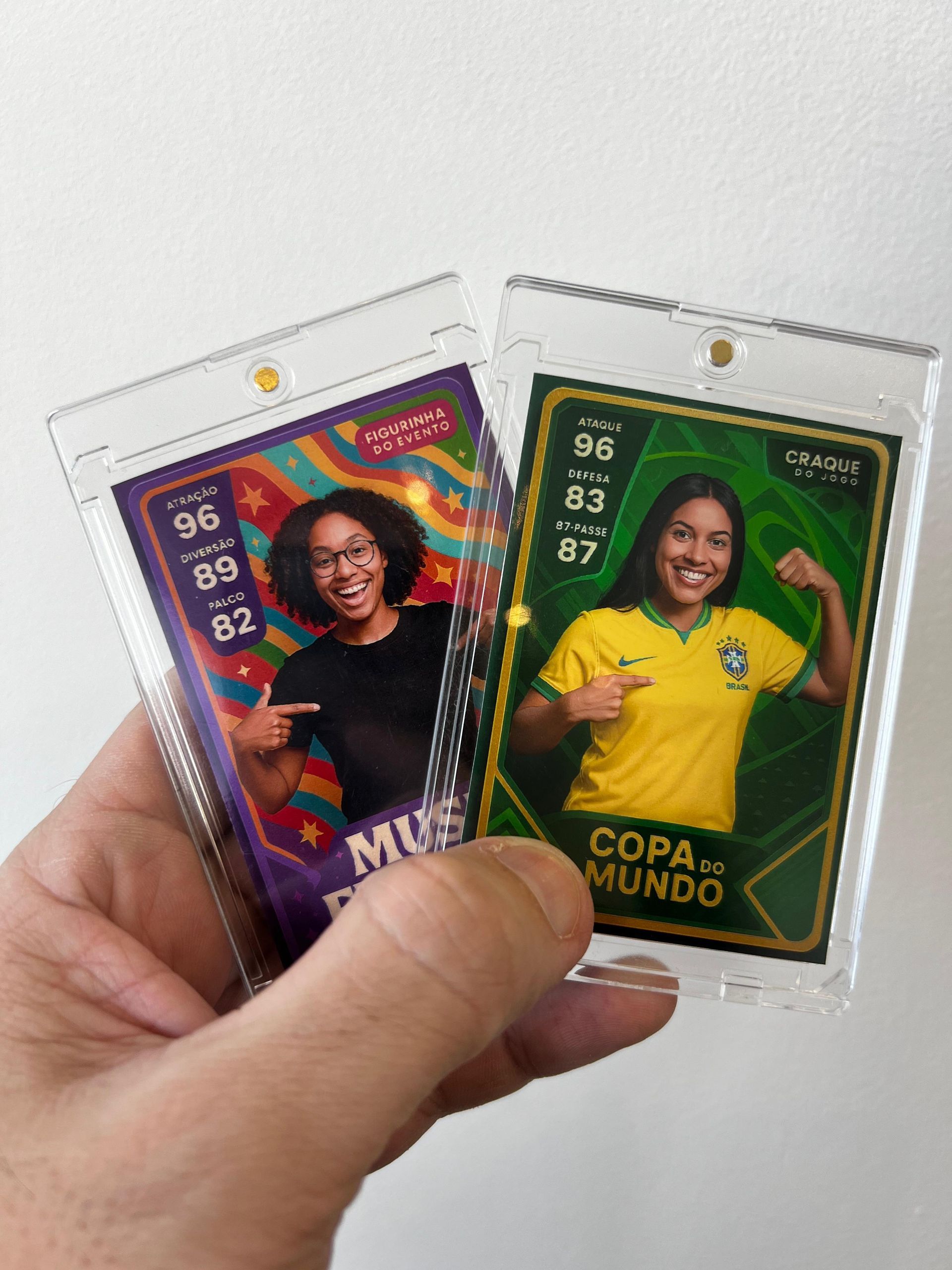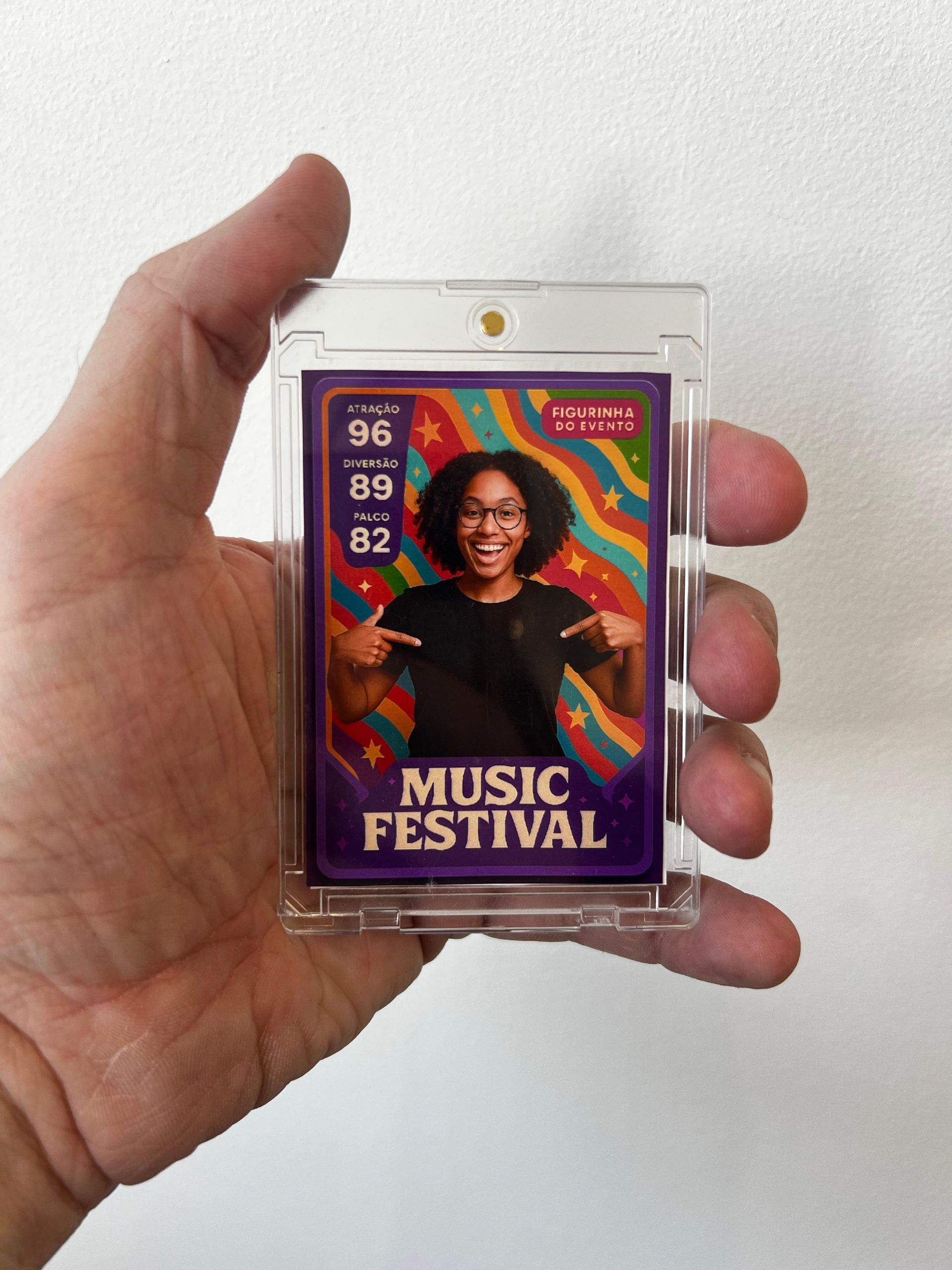 Na ativação Cards Colecionáveis, o participante vira uma verdadeira peça de coleção! Com fotos tiradas na hora, ele se transforma em um card exclusivo e totalmente customizado — seja no estilo esportivo, empresarial, gamer ou o que a ação pedir. Com molduras personalizadas e efeitos de IA, cada pessoa leva pra casa uma lembrança única e épica da experiência.