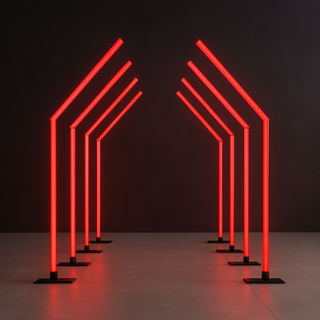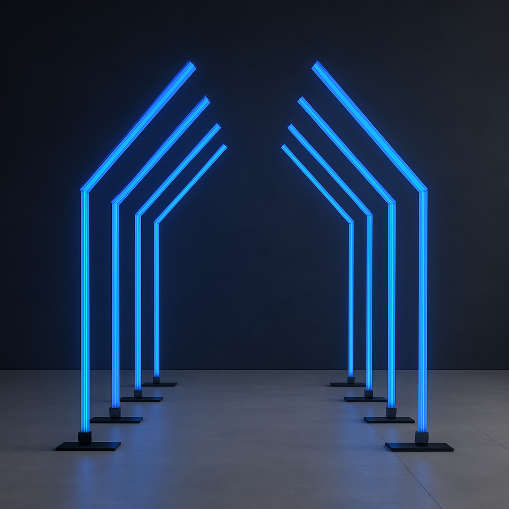 As Setas de LED são uma solução cenográfica moderna e versátil, perfeita para criar entradas impactantes, corredores imersivos ou destacar áreas estratégicas em eventos. Com design angular e não curvado, as estruturas podem ser posicionadas de forma mais compacta ou espaçada, criando diferentes sensações de profundidade, movimento e direção.